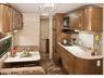 Queen bed, closets on either side of the bed. Dinette with overhead storage and radio, opposite side has a double kitchen sink, range, refrigerator, and additional overhead storage. Rear has private bathroom with a closet, sink, linen cabinet over the toilet, and a 34" corner shower.